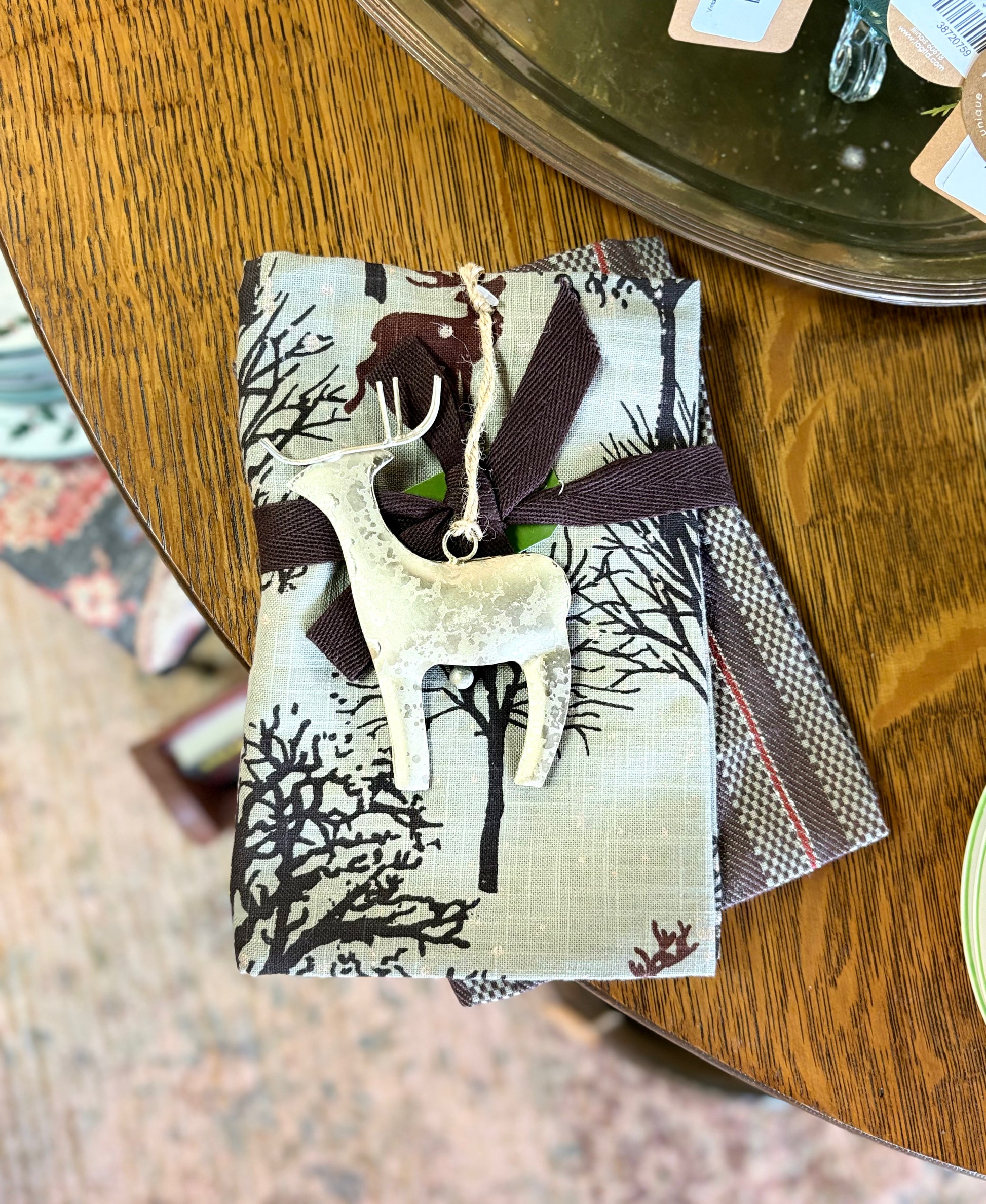 holiday dishtowel set which includes 2 different designs: 1 hand screen printed and 1 woven dobby stripe. excellent for gifting or as additions to your kitchen household cleaning essentials. bonus: includes iron ornament with jute cord for hanging.