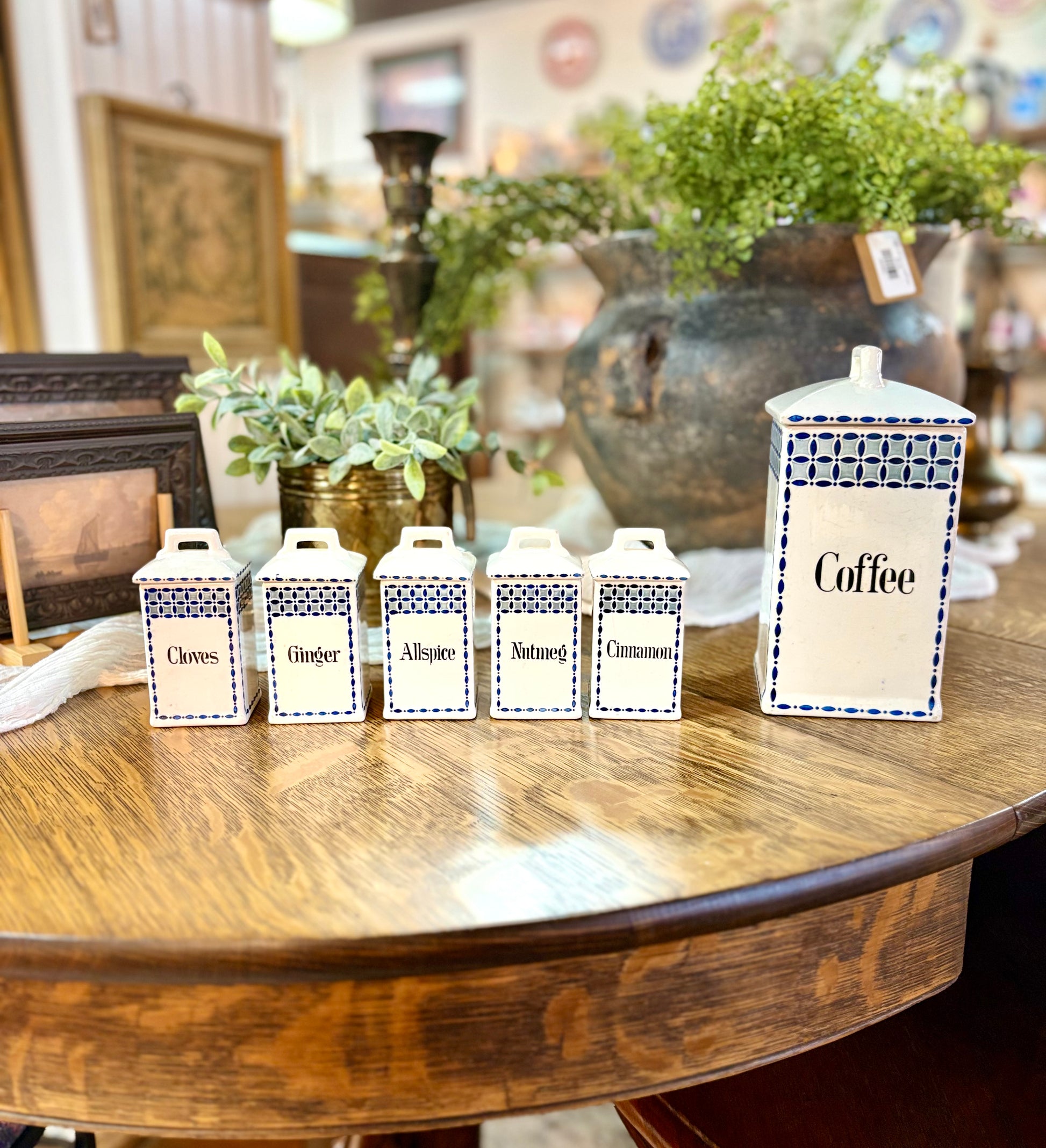 Nutmeg, ginger, cloves, cinnamon, allspice: height 4.25”x 2” wide